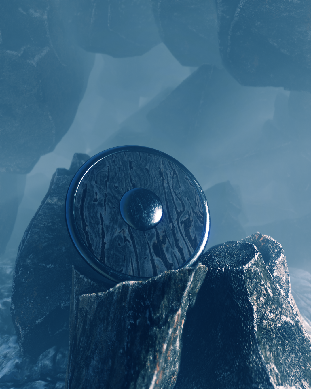 Making use of the same cave set that I had constructed for the sword render, I chose to create a shield asset that could be paired with the sword. With a few rearrangements of the rocks, lighting and god rays, the final product is as can be seen here. It manages to catch the same wonder and mystery as the sword scene, creating a sense of unity between the pieces that I wanted to see.